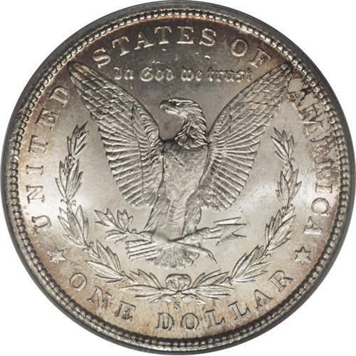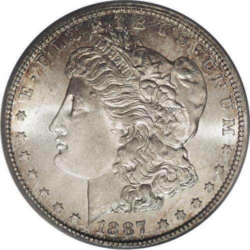<B>1887-S S$1 MS65 PCGS.</B></I> The only recorded quantities of Mint State 1887-S Morgan dollars that entered the numismatic market did so in the 1940s and 1950s. These releases (mostly from storage in the San Francisco Mint) have resulted in a significant number of MS60-MS64 examples in today's market, but Gems remain elusive. Typically well produced for the issue, both sides are sharply struck throughout, with swirling, frosty cartwheel luster. There are no singularly distracting abrasions, and the otherwise untoned features reveal original peripheral toning in reddish-golden shades.<BR><BR><b>Shipping:</b> Coins & Currency (<a target="_blank" href="http://www.heritageauctions.com/common/shipping.php">view shipping information</a>)