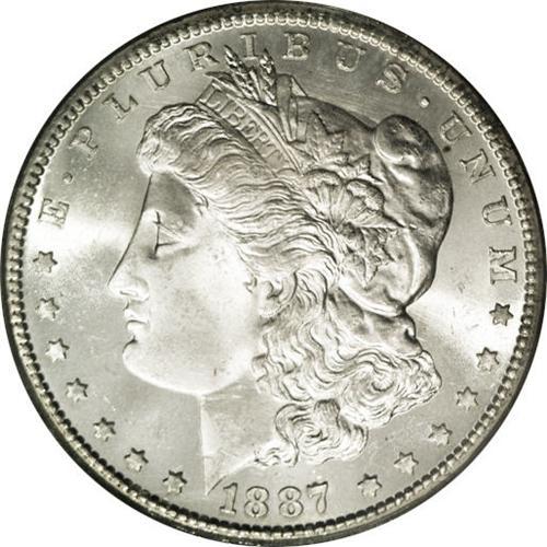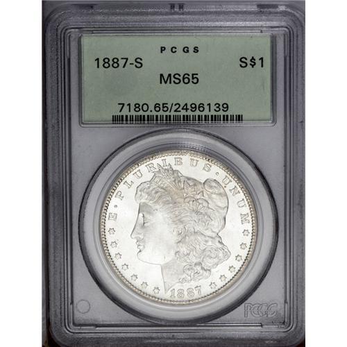 <B>1887-S<img border='0' src='http://www.heritagecoins.com/images/star.gif' width=10 height=10>$1 MS65 PCGS.</B></I> This impressive Gem example creates instant eye appeal through its combination of brilliant cartwheel luster, razor-sharp strike, and minimally abraded surfaces. A faint reverse die crack runs from the bottom of the E in UNITED to the eagle's left (facing) wingtip. PCGS has graded 25 examples finer (1/06).<BR><I>From The Leslie E. Lunsford Collection, #7 Current Finest Registry Morgan Dollars Basic Set, Circulation Strikes.</B></I>