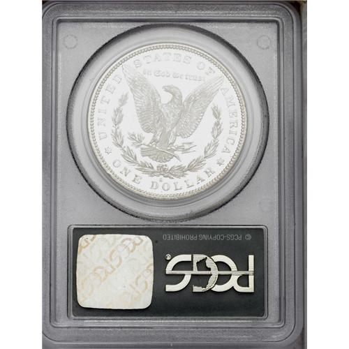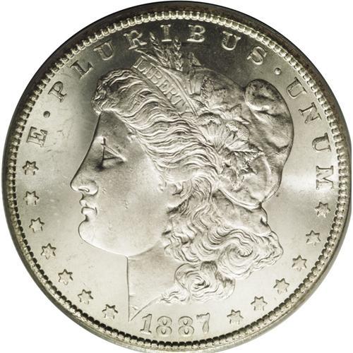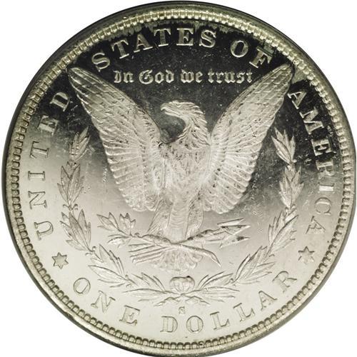 <B>1887-S<img border='0' src='http://www.heritagecoins.com/images/star.gif' width=10 height=10>$1> MS65 PCGS.</B></I> VAM-4, repunched 1 in date. The reverse possesses a dramatic, deeply mirrored field that contrasts with the frosty eagle and wreath. The obverse, however, features cartwheel luster more customary for the issue. A lightly toned and moderately abraded representative, housed in a green label holder.