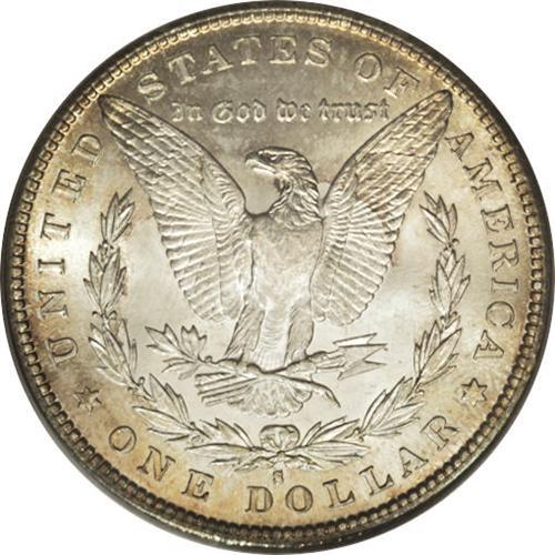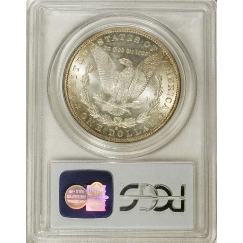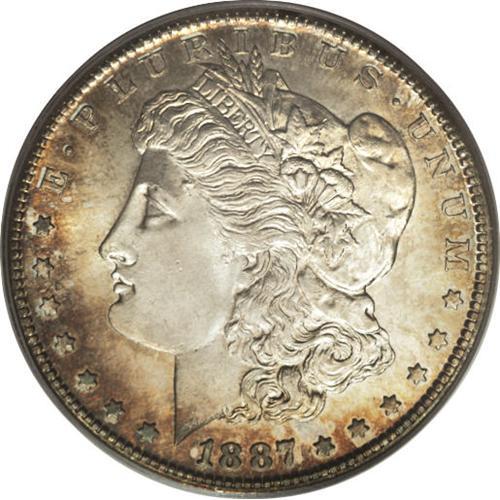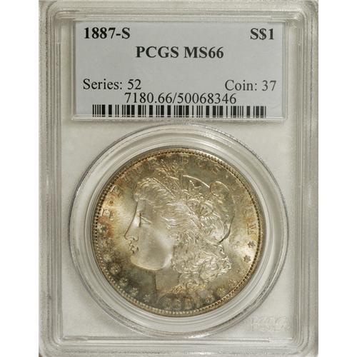 <B>1887-S S$1 MS66 PCGS.</B></I> Despite a respectable mintage of more than 1.7 million pieces, this S-mint issue is elusive above MS64. The reverse is lightly toned, with reddish-golden iridescence at the borders. The obverse exhibits a wider distribution of similar colors, but deeper in hue. As befits a cartwheel from the California branch mint, the features exhibit needle-sharp delineation that brings up every last detail of the central highpoints. Both sides are largely devoid of contact marks and other distractions. This richly frosted dollar would convert even the most ardent critic into a collector of Morgans. Population: 19 in 66, 0 finer (3/07).<BR><BR><b>Shipping:</b> Coins & Currency (<a target="_blank" href="http://www.heritageauctions.com/common/shipping.php">view shipping information</a>)