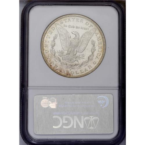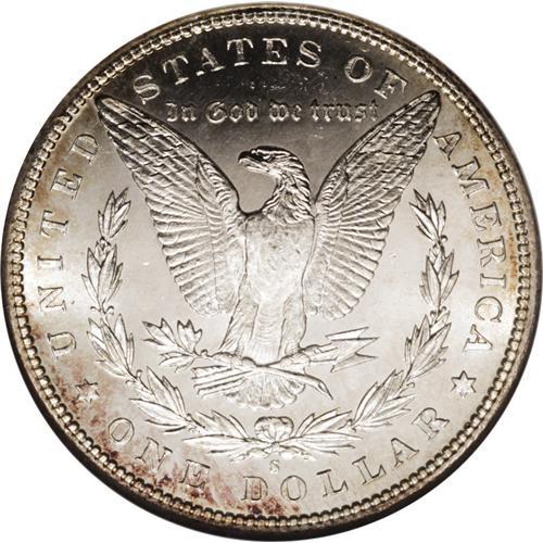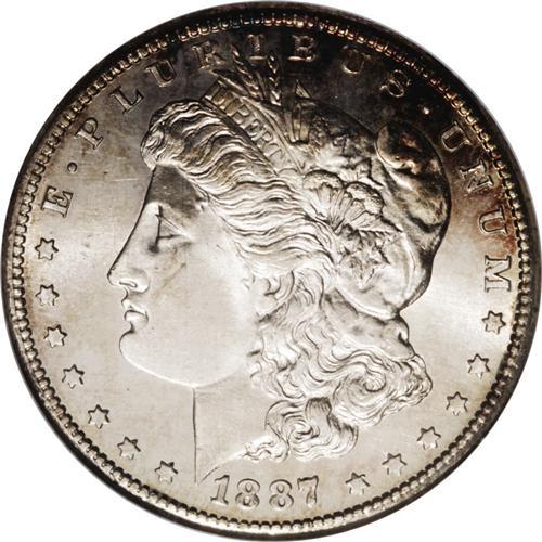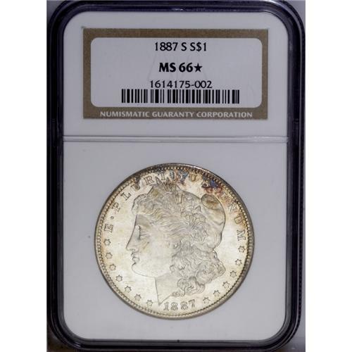 <B>1887-S<img border='0' src='http://www.heritagecoins.com/images/star.gif' width=10 height=10>$1 MS66 <img border='0' src='http://www.heritagecoins.com/images/star.gif' width=10 height=10> NGC.</B></I> Blushes of navy-blue and orange color enrich the borders of this gorgeous premium Gem. The strike is penetrating, and the cheek and the semi-prooflike fields are exceptionally smooth. Those in search of the finest quality collection need look no further. The single highest graded star designated 1887-S dollar, although NGC has certified one piece as MS67 without a <img border='0' src='http://www.heritagecoins.com/images/star.gif' width=10 height=10> notation.