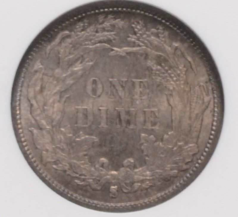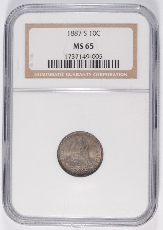 1887-S SEATED DIME, NGC MS-65 GEM, SUPER COLORS