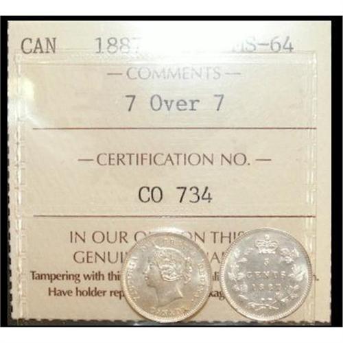 1887 over 7 5¢ ICCS MS64PQ. Wow! Wow! An amazing Victoria five cent silver example. Excellent strike with clean fields and great surfaces. Fully brilliant and lustrous. The nicest example ever handled by TCNC. Possibly the finest known! Extremely rare!