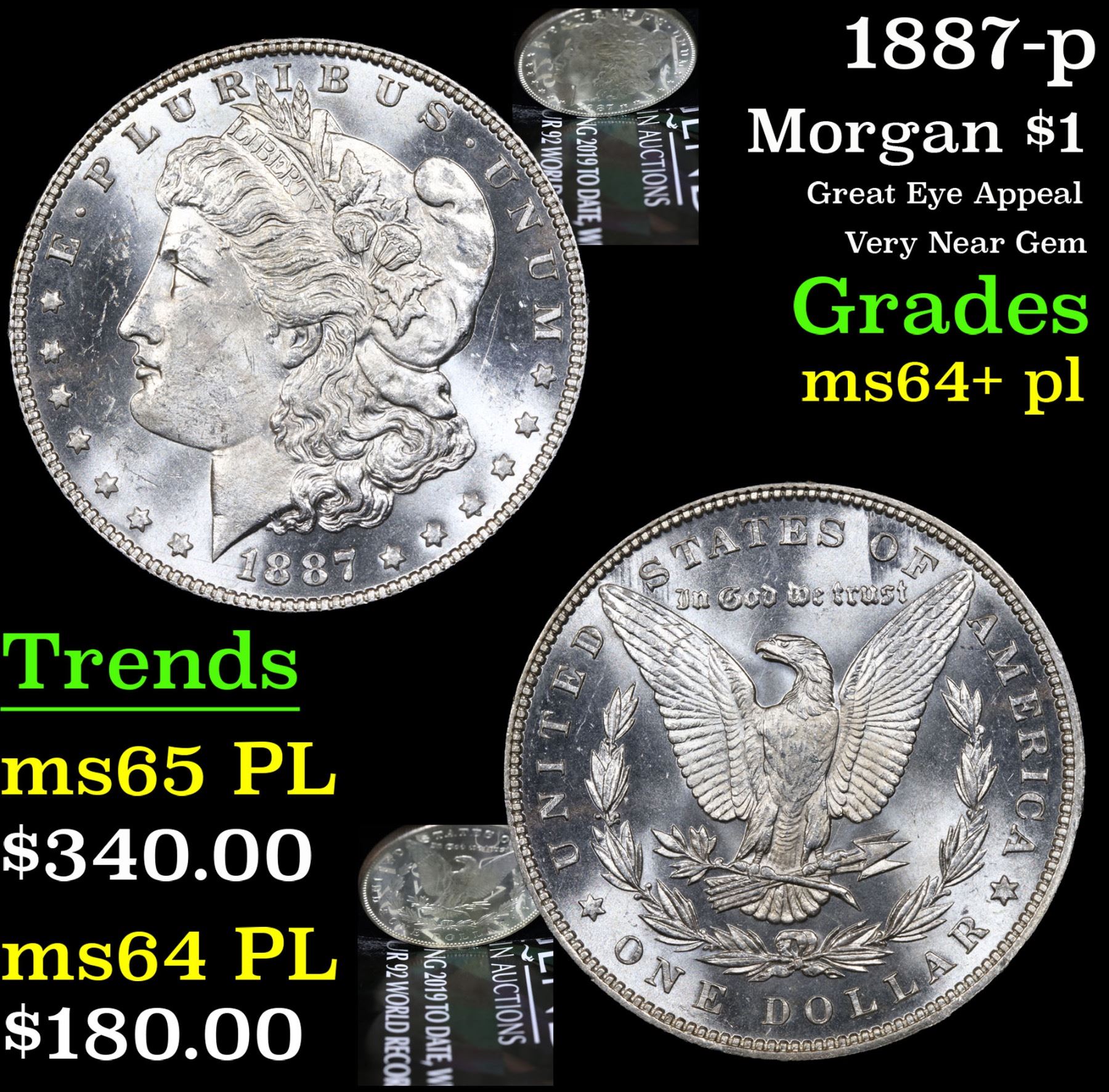 1887-p Great Eye Appeal Very Near Gem Morgan Dollar $1 Grades Choice Unc+ PL.