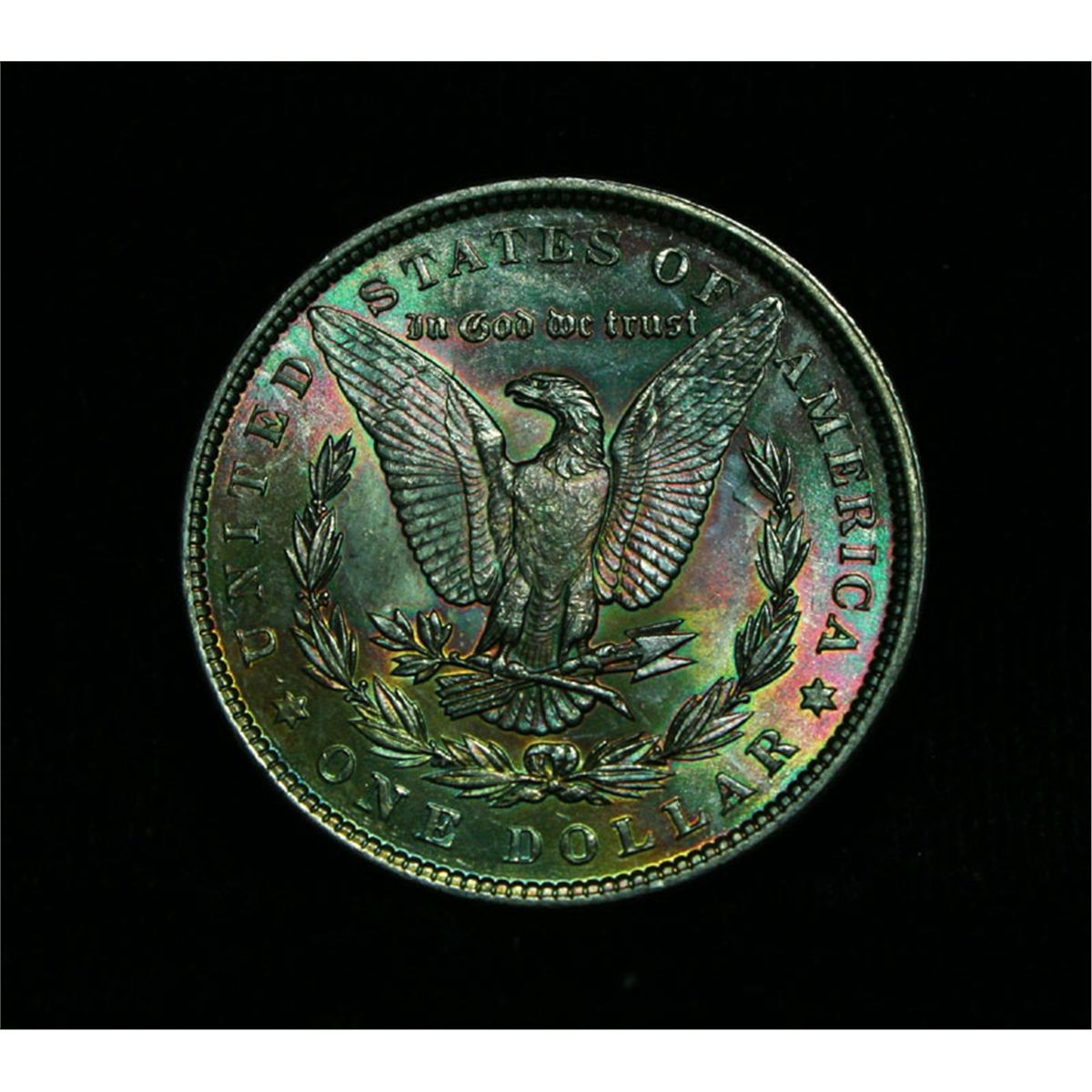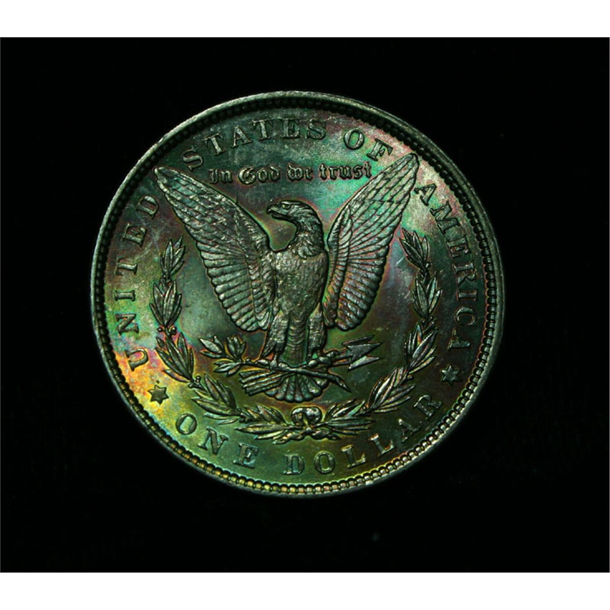 A Beautiful colorfully toned reverse highlight this super coin. Excellent Luster, Super eye appeal. The Obverse is 95% Blast White with a touch of rim toning. The reverse though has deep wonderful colors throughout, Greens, Purples and Blues dominate. Plus this is the VAM 21a. Estimated Value $150