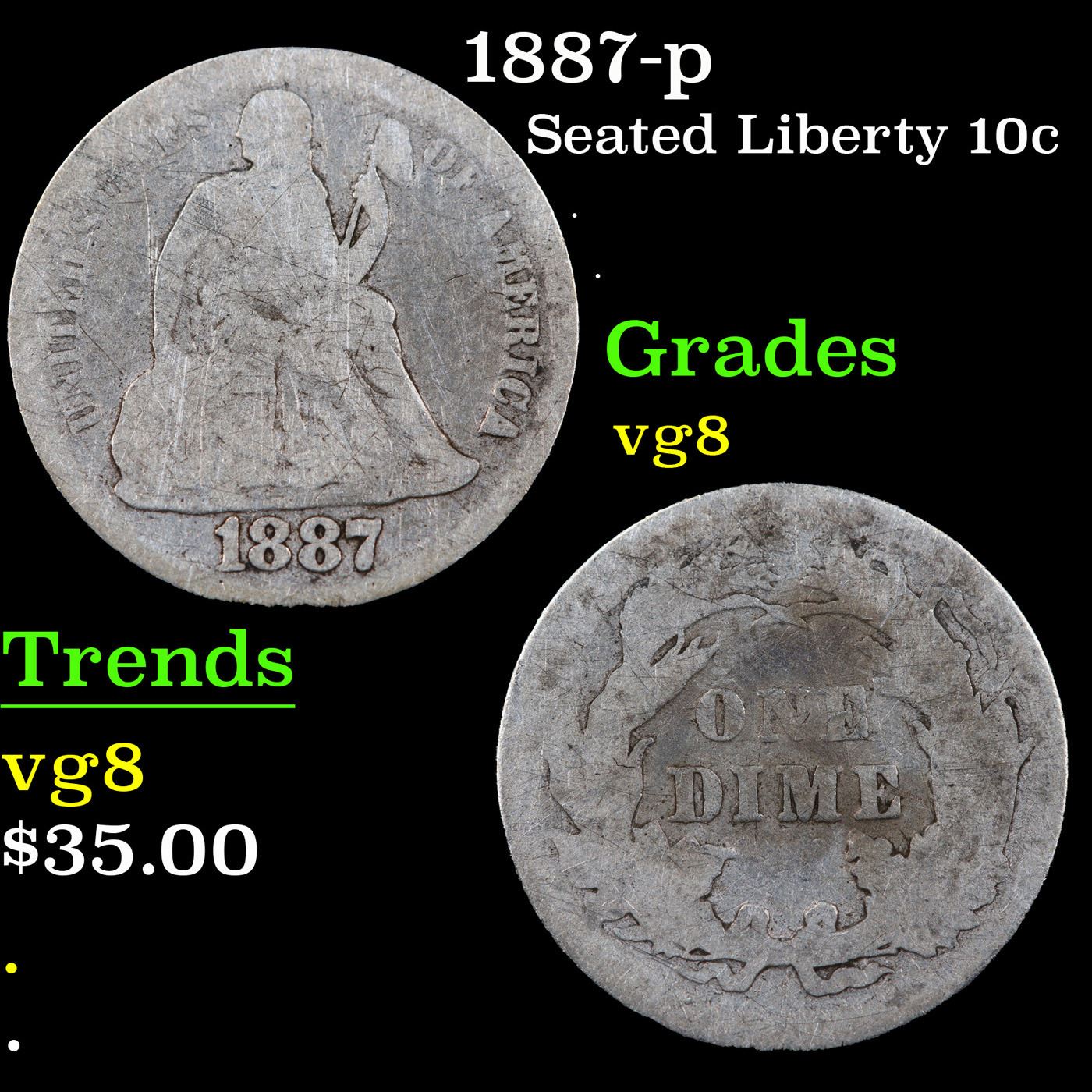 1887-p Seated Liberty Dime 10c Grades vg, very good.