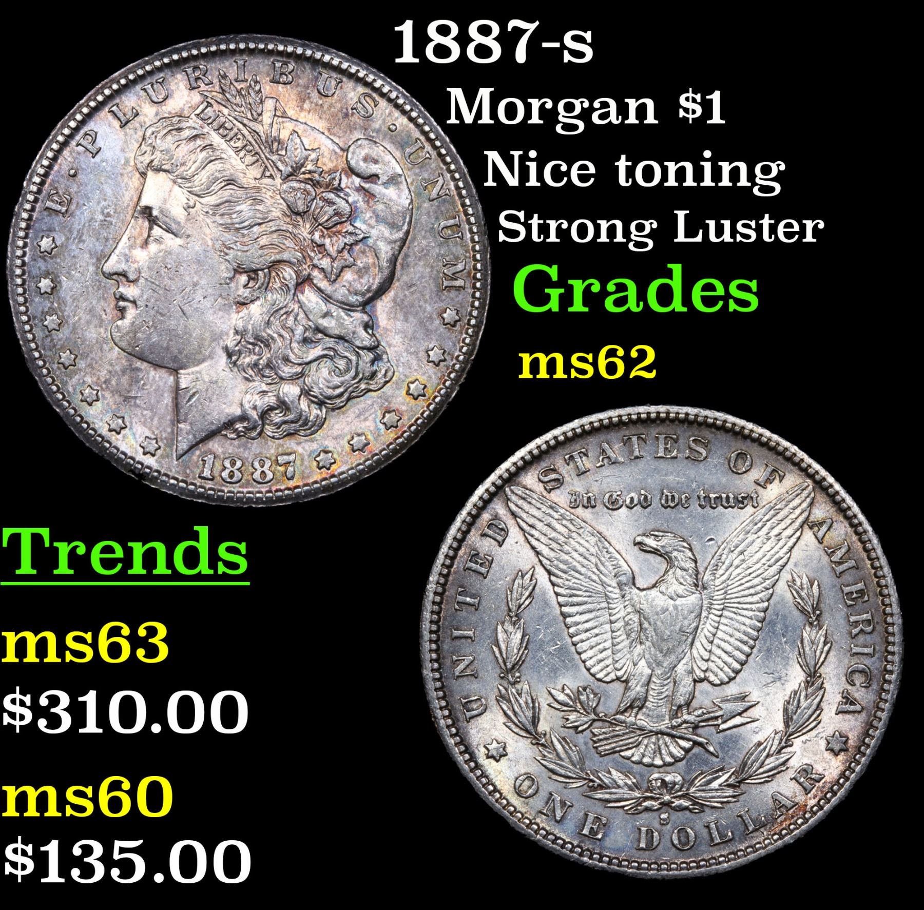 1887-s Nice toning Strong Luster Morgan Dollar $1 Grades Select Unc.