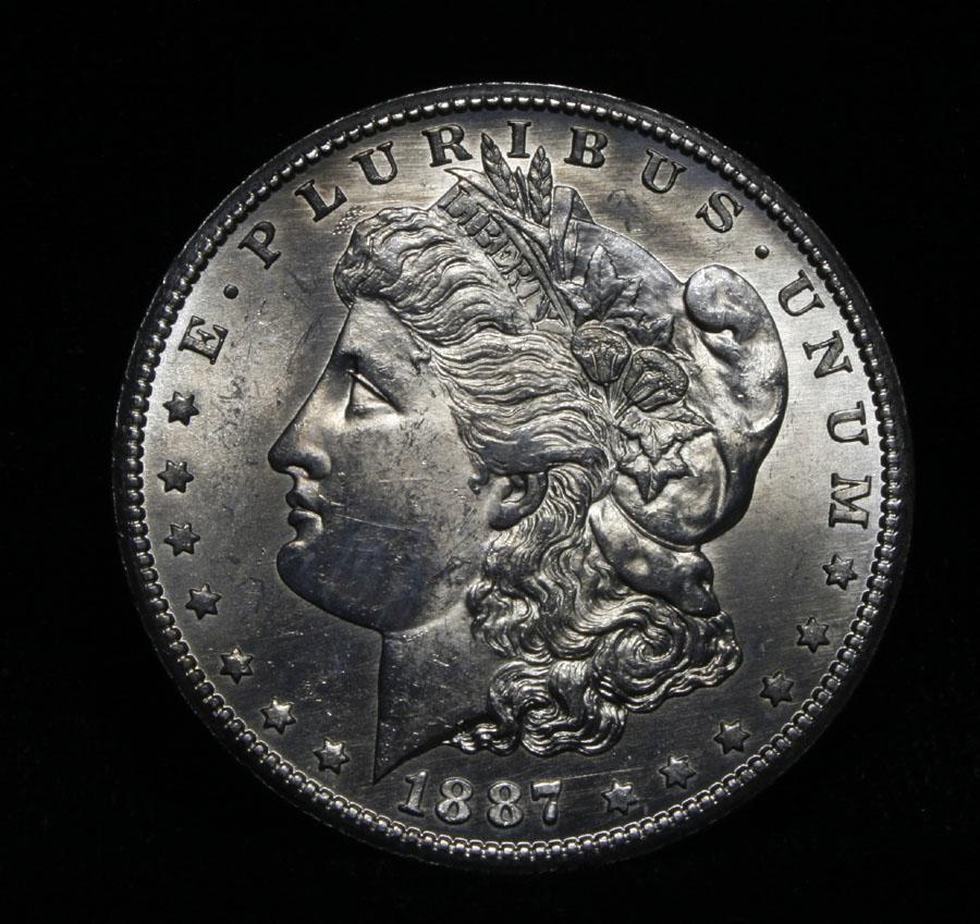 Upon initial examination this looks like a wonderful PL 1887-s, with a great strike and great mirrored fields. Even under 10x magnification it appears such, but upon slow inspection under 16x, I discovered that some overzealous party has brushed the coin in several locations. It did not need this as it was a great example with PL fields. It still has a great look with great mirrored fields, but I will estimate its value as a straight ms60 instead of ms65 PL that it should have bee, Estimated Value $100