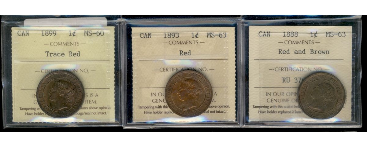 1888 1¢, 1893 MS63 & 1899 MS60. Lot of 3 ICCS graded coins RB, RD & Trace red respectively.