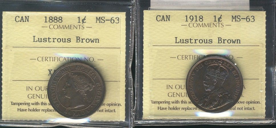 1888 1¢ & 1918 ICCS MS63. Lot of 2 coins both lustrous brown.