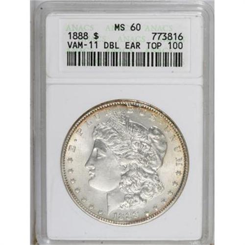<B>1888 $1 MS60 ANACS.</B></I> VAM-11 Doubled Ear Top 100. NGC Census: (19/25365). PCGS Population (46/22647). Mintage: 19,183,832. Numismedia Wsl. Price for NGC/PCGS coin in MS60: $27. (#7182)<BR><BR><B>Coin Engraver:</B> George T. Morgan<BR><BR><b>Shipping:</b> Coins & Currency (<a target="_blank" href="http://www.heritageauctions.com/common/shipping.php">view shipping information</a>)