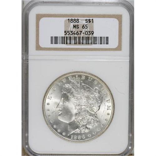 <B>1888 $1 MS65 NGC.</B></I> NGC Census: (4249/636). PCGS Population (2682/474). Mintage: 19,183,832. Numismedia Wsl. Price for NGC/PCGS coin in MS65: $144. (#7182)<BR><BR><b>Shipping:</b> Coins & Currency (<a target="_blank" href="http://www.heritageauctions.com/common/shipping.php">view shipping information</a>)