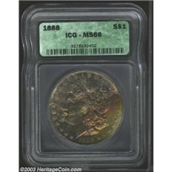 <TR><TD width="100%"><TABLE cellSpacing=1 cellPadding=3 width="100%" border=0><TBODY><TR><TD width="100%" bgColor=#79735c><FONT face=arial color=#ffffff size=3><B>Description</B> </FONT></TD></TR><TR><TD width="100%" bgColor=#ffffff><FONT face=arial size=2><B>1888 $1 MS66 ICG.</B></I> Well struck and exquisitely preserved, the obverse is blanketed by a plethora of rainbow colors. The reverse has attractive peripheral toning, and virtually pristine, lightly dappled surfaces. </FONT></TD></TR></TBODY></TABLE></TD></TR></TBODY></TABLE><BR><A name=PricesRealized></A><TABLE cellSpacing=0 cellPadding=0 width="100%" bgColor=#000000 border=0><TBODY><TR><TD width="100%"><TABLE cellSpacing=1 cellPadding=3 width="100%" border=0><TBODY><TR><TD width="100%" bgColor=#79735c><A name=PR><FONT face=arial color=#ffffff size=3><B>Previous Prices from Heritage Auctions</B> </FONT></A></TD></TR><TR><TD bgColor=#f6f6ed><TABLE cellSpacing=0 cellPadding=0 width="100%" border=1><TBODY><TR><TD align=middle width="33%"><B>Date</B></TD><TD align=middle width="33%"><B>Service</B></TD><TD align=middle width="33%"><B>Price</B></TD></TR><TR bgColor=whitesmoke><TD width="33%"><B>01/11/2003</B></TD><TD width="33%">PCGS</TD><TD width="33%">$552.00</TD></TR><TR bgColor=whitesmoke><TD width="33%"><B>01/11/2003</B></TD><TD width="33%">PCGS</TD><TD width="33%">$540.50</TD></TR><TR bgColor=whitesmoke><TD width="33%"><B>03/02/2000</B></TD><TD width="33%">PCGS</TD><TD width="33%">$632.50</TD></TR><TR bgColor=whitesmoke><TD width="33%"><B>10/17/2000</B></TD><TD width="33%">PCGS</TD><TD width="33%">$525.00</TD></TR><TR bgColor=whitesmoke><TD width="33%"><B>08/13/1996</B></TD><TD width="33%">PCGS</TD><TD width="33%">$577.50</TD></TR><TR bgColor=whitesmoke><TD width="33%"><B>09/09/1994</B></TD><TD width="33%">PCGS</TD><TD width="33%">$715.00</TD></TR><TR bgColor=whitesmoke><TD width="33%"><B>07/31/1993</B></TD><TD width="33%">PCGS</TD><TD width="33%">$935.00</TD></TR><TR bgColor=whitesmoke><TD width="33%"><B>12/03/1993</B></TD><TD width="33%">PCGS</TD><TD width="33%">$742.50</TD></TR><TR bgColor=whitesmoke><TD width="33%"><B>10/06/2000</B></TD><TD width="33%">PCGS</TD><TD width="33%">$402.50</TD></TR><TR bgColor=whitesmoke><TD width="33%"><B>04/14/2000</B></TD><TD width="33%">PCGS</TD><TD width="33%">$690.00</TD></TR><TR bgColor=whitesmoke><TD width="33%"><B>06/04/1999</B></TD><TD width="33%">PCGS</TD><TD width="33%">$546.25</TD></TR><TR bgColor=whitesmoke><TD width="33%"><B>09/10/1997</B></TD><TD width="33%">PCGS</TD><TD width="33%">$687.50</TD></TR><TR bgColor=whitesmoke><TD width="33%"><B>02/02/1996</B></TD><TD width="33%">PCGS</TD><TD width="33%">$577.50</TD></TR><TR bgColor=whitesmoke><TD width="33%"><B>09/13/1997</B></TD><TD width="33%">PCGS</TD><TD width="33%">$488.75</TD></TR><TR bgColor=whitesmoke><TD width="33%"><B>07/31/1993</B></TD><TD width="33%">PCGS</TD><TD width="33%">$1,045.00</TD></TR><TR bgColor=whitesmoke><TD width="33%"><B>11/19/2002</B></TD><TD width="33%">PCGS</TD><TD width="33%">$540.50</TD></TR><TR bgColor=whitesmoke><TD width="33%"><B>09/28/2002</B></TD><TD width="33%">PCGS</TD><TD width="33%">$517.50</TD></TR><TR bgColor=whitesmoke><TD width="33%"><B>09/28/2002</B></TD><TD width="33%">PCGS</TD><TD width="33%">$546.25</TD></TR><TR bgColor=whitesmoke><TD width="33%"><B>02/16/2000</B></TD><TD width="33%">PCGS</TD><TD width="33%">$518.00</TD></TR><TR bgColor=whitesmoke><TD width="33%"><B>01/01/2001</B></TD><TD width="33%">PCGS</TD><TD width="33%">$529.00</TD></TR><TR bgColor=whitesmoke><TD width="33%"><B>07/30/2002</B></TD><TD width="33%">PCGS</TD><TD width="33%">$488.75</TD></TR><TR bgColor=whitesmoke><TD width="33%"><B>06/08/2002</B></TD><TD width="33%">PCGS</TD><TD width="33%">$488.75</TD></TR><TR bgColor=whitesmoke><TD width="33%"><B>04/27/2002</B></TD><TD width="33%">PCGS</TD><TD width="33%">$747.50</TD></TR><TR bgColor=whitesmoke><TD width="33%"><B>01/12/2002</B></TD><TD width="33%">PCGS</TD><TD width="33%">$460.00</TD></TR><TR bgColor=whitesmoke><TD width="33%"><B>01/12/2002</B></TD><TD width="33%">PCGS</TD><TD width="33%">$506.00</TD></TR><TR bgColor=whitesmoke><TD width="33%"><B>11/15/2001</B></TD><TD width="33%">PCGS</TD><TD width="33%">$488.75</TD></TR><TR bgColor=whitesmoke><TD width="33%"><B>10/23/2001</B></TD><TD width="33%">PCGS</TD><TD width="33%">$500.00</TD></TR><TR bgColor=whitesmoke><TD width="33%"><B>10/06/2001</B></TD><TD width="33%">PCGS</TD><TD width="33%">$718.75</TD></TR><TR bgColor=whitesmoke><TD width="33%"><B>10/06/2001</B></TD><TD width="33%">PCGS</TD><TD width="33%">$506.00</TD></TR><TR bgColor=whitesmoke><TD width="33%"><B>01/08/1999</B></TD><TD width="33%">PCGS</TD><TD width="33%">$632.50</TD></TR><TR bgColor=whitesmoke><TD width="33%"><B>02/01/1999</B></TD><TD width="33%">PCGS</TD><TD width="33%">$920.00</TD></TR><TR bgColor=whitesmoke><TD width="33%"><B>02/23/2001</B></TD><TD width="33%">PCGS</TD><TD width="33%">$1,840.00</TD></TR><TR bgColor=whitesmoke><TD width="33%"><B>01/23/2001</B></TD><TD width="33%">PCGS</TD><TD width="33%">$500.00</TD></TR><TR bgColor=whitesmoke><TD width="33%"><B>10/01/1998</B></TD><TD width="33%">PCGS</TD><TD width="33%">$577.00</TD></TR><TR bgColor=whitesmoke><TD width="33%"><B>07/31/1993</B></TD><TD width="33%">PCGS</TD><TD width="33%">$935.00</TD></TR><TR bgColor=whitesmoke><TD width="33%"><B>04/05/2001</B></TD><TD width="33%">PCGS</TD><TD width="33%">$575.00</TD></TR><TR bgColor=whitesmoke><TD width="33%"><B>06/05/1999</B></TD><TD width="33%">PCGS</TD><TD width="33%">$605.00</TD></TR><TR bgColor=whitesmoke><TD width="33%"><B>01/05/1994</B></TD><TD width="33%">PCGS</TD><TD width="33%">$891.00</TD></TR><TR bgColor=whitesmoke><TD width="33%"><B>11/21/1997</B></TD><TD width="33%">NGC</TD><TD width="33%">$440.00</TD></TR><TR bgColor=whitesmoke><TD width="33%"><B>09/13/1997</B></TD><TD width="33%">NGC</TD><TD width="33%">$488.75</TD></TR><TR bgColor=whitesmoke><TD width="33%"><B>11/17/2000</B></TD><TD width="33%">NGC</TD><TD width="33%">$379.50</TD></