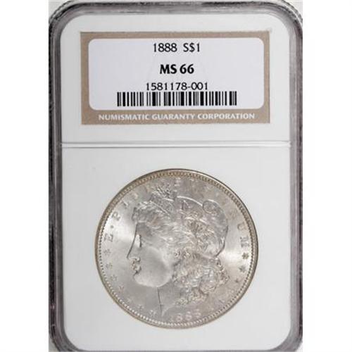 <B>1888 $1 MS66 NGC.</B></I> NGC Census: (623/37). PCGS Population (498/11). Mintage: 19,183,832. Numismedia Wsl. Price for NGC/PCGS coin in MS66: $510. (#7182)<BR><BR><B>Coin Engraver:</B> George T. Morgan<BR><BR><b>Shipping:</b> Coins & Currency (<a target="_blank" href="http://www.heritageauctions.com/common/shipping.php">view shipping information</a>)