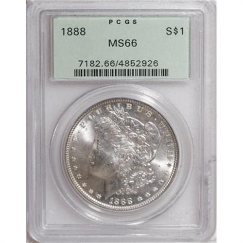 <B>1888 $1 MS66 PCGS.</B></I> PCGS Population (464/10). NGC Census: (605/36). Mintage: 19,183,832. Numismedia Wsl. Price for NGC/PCGS coin in MS66: $510. (#7182)<BR><BR><B>Coin Engraver:</B> George T. Morgan<BR><BR><b>Shipping:</b> Coins & Currency (<a target="_blank" href="http://www.heritageauctions.com/common/shipping.php">view shipping information</a>\)