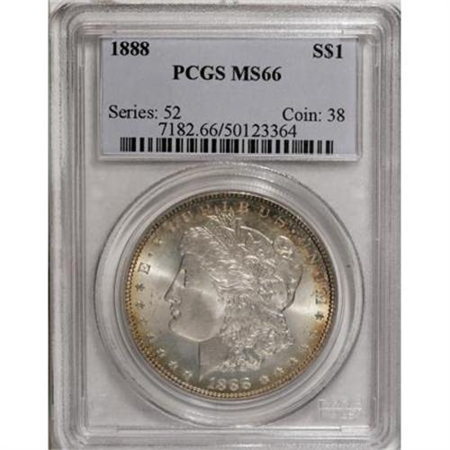 <B>1888 $1 MS66 PCGS.</B></I> Shining silver-gray centers cede to gold-orange, rose, and violet-blue at the margins. Pleasing detail and excellent luster and preservation. PCGS has graded 11 finer pieces (12/07).<BR><I>From The Jimmy G. PCGS Registry Collection of Morgan Dollars with Varieties.</B></I><BR><BR><B>Coin Engraver:</B> George T. Morgan<BR><BR><b>Shipping:</b> Coins & Currency (<a target="_blank" href="http://www.heritageauctions.com/common/shipping.php">view shipping information</a>)
