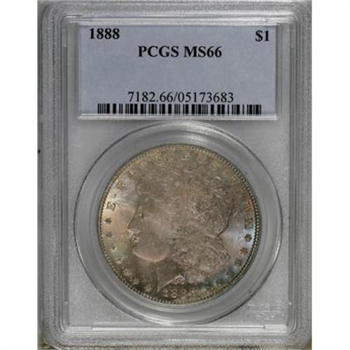 <B>1888 $1 MS66 PCGS.</B></I> Well struck and highly lustrous. Plum, orange, and lavender patina on the obverse contrasts with the brilliant reverse. Amazing eye appeal and almost unimprovable preservation. PCGS has certified just 11 finer pieces (1/08).<BR><BR><B>Coin Engraver:</B> George T. Morgan<BR><BR><b>Shipping:</b> Coins & Currency (<a target="_blank" href="http://www.heritageauctions.com/common/shipping.php">view shipping information</a>)