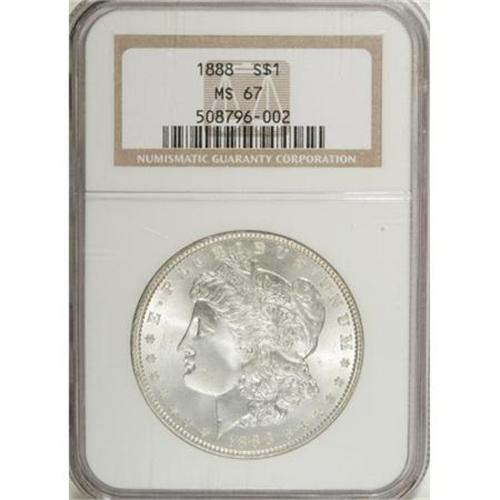 <B>1888 $1 MS67 NGC.</B></I> Bright luster exudes from the untoned surfaces of this lovely Superb Gem Morgan, and a well executed strike manifests itself in crisp definition on the design features, further enhancing the coin's outstanding eye appeal. Near-pristine surfaces are the rule on both obverse and reverse. Large quantities of this issue were released by the Treasury Department between 1955 and 1964 (David Bowers, 2006). Census: 35 in 67, 1 finer (6/07).<BR><I>From the Reuben Reinstein Collection.</B></I><BR><BR><b>Shipping:</b> Coins & Currency (<a target="_blank" href="http://www.heritageauctions.com/common/shipping.php">view shipping information</a>)