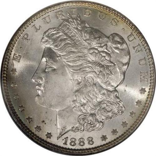 <B>1888 $1 MS67 NGC.</B></I> Ex: Binion Collection. Attractive amber-gold, cobalt-blue, and mint-green patina adorns the reverse, while the obverse is largely brilliant, save for a crescent of amber-gold at the right rim. Few examples of this otherwise available issue have received this lofty grade. Census: 36 in 67, 1 finer (7/07).<BR><BR><B>Coin Engraver:</B> George T. Morgan<BR><BR><b>Shipping:</b> Coins & Currency (<a target="_blank" href="http://www.heritageauctions.com/common/shipping.php">view shipping information</a>\)