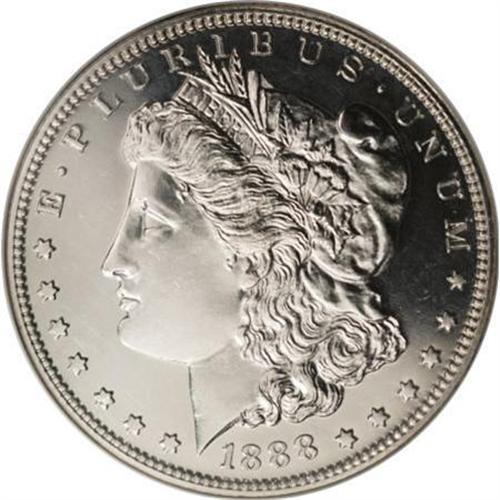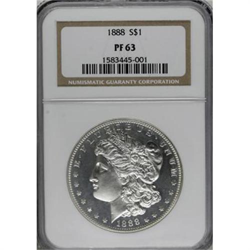 <B>1888 $1 PR63 NGC.</B></I> Breen-5600, "Very rare." The date is repunched left, most prominently on the 1. This untoned Select specimen has thick frost on the eagle and wreath, and Liberty's hair and cap are also icy. The fields have unusually few hairlines for the PR63 grade. Only 832 proofs were struck.<BR><BR><B>Coin Engraver:</B> George T. Morgan<BR><BR><b>Shipping:</b> Coins & Currency (<a target="_blank" href="http://www.heritageauctions.com/common/shipping.php">view shipping information</a>\)