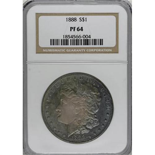 <B>1888 $1 PR64 NGC.</B></I> The 832 proof Morgan dollars of 1888 were distributed as the highest-denomination pieces in government sets of minor proof silver. Of the survivors known today, few have such a distinctive appearance as this immensely appealing Choice proof. Warm rose patina graces the portrait and eagle, while the fields exhibit dusky violet and blue toning. Well-defined overall, though the hair above the ear is a trifle soft, and mildly reflective beneath the rich patina. A handful of faint, scattered hairlines define the grade. Census: 46 in 64, 37 finer (7/07).<BR><BR><B>Coin Engraver:</B> George T. Morgan<BR><BR><b>Shipping:</b> Coins & Currency (<a target="_blank" href="http://www.heritageauctions.com/common/shipping.php">view shipping information</a>\)