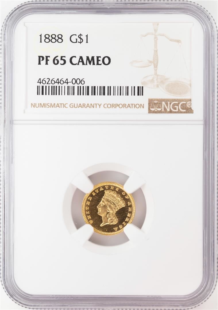 One 1888 $1 Proof Indian Princess Head Gold Dollar Coin NGC PF65 Cameo. NGC Certified.