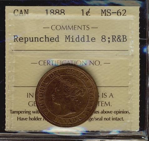 1888 1¢ Repunched Middle 8 ICCS MS62RB,