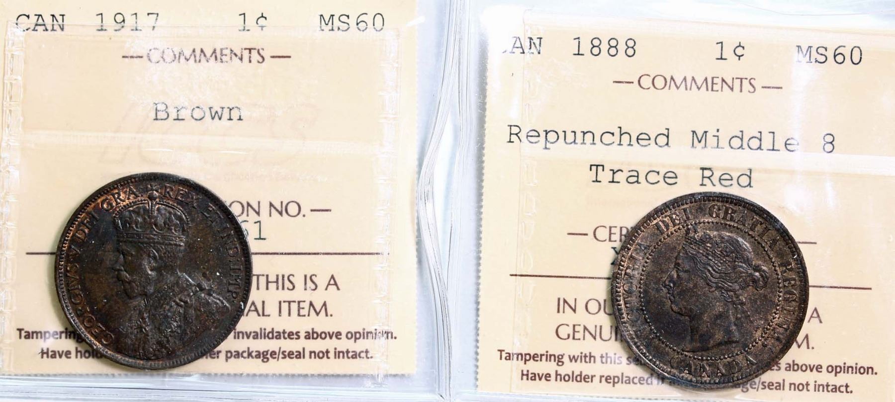 1888 1¢ Repunched Middle 8 Trace Red, 1917 1¢ Brown, Both ICCS Mint State-60.