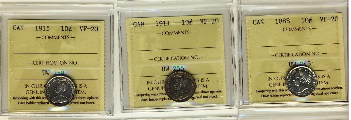 1888 10¢, 1911 & 1915 ICCS VF20. Lot of 3 coins.
