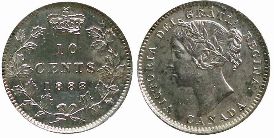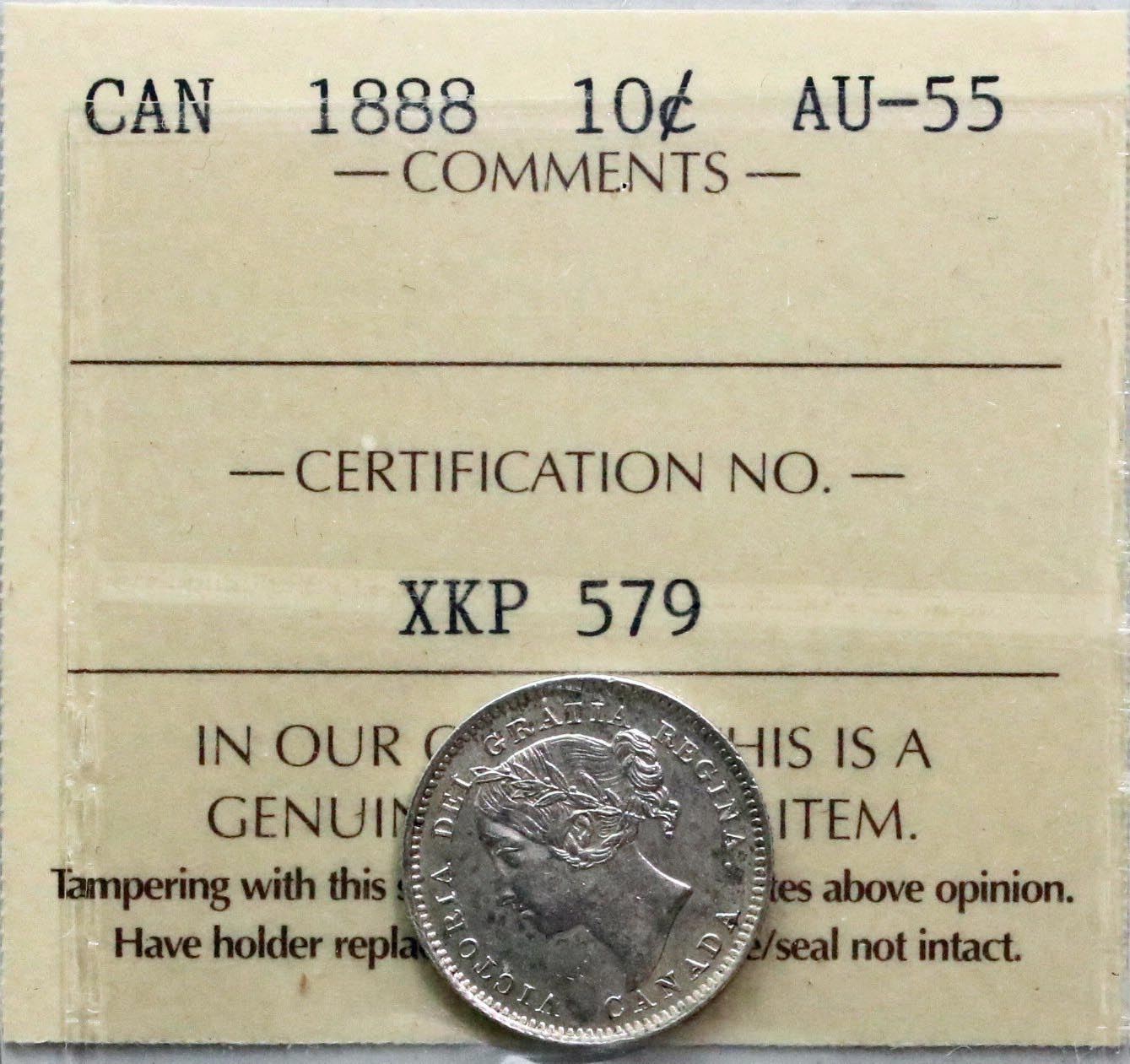 1888 10¢ ICCS Choice About Uncirculated-55. A tough issue with strong details and nice lustre.