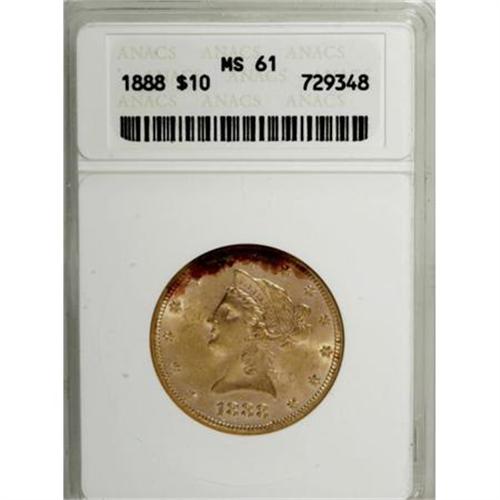 <B>1888 $10 MS61 ANACS.</B></I> Sharply struck with good luster and a number of minor abrasions in the obverse field. The upper obverse has a purple-brown patina. A lower mintage and conditionally rare issue that is very difficult to obtain any finer.<BR><BR><B>Coin Engraver:</B> Christian Gobrecht<BR><BR><b>Shipping:</b> Coins & Currency (<a target="_blank" href="http://www.heritageauctions.com/common/shipping.php">view shipping information</a>)