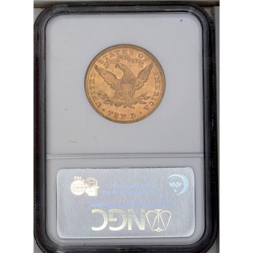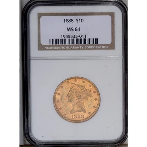 <B>1888<$10> MS61 NGC.</B></I> A piece that has good detail for this issue. The somewhat subdued yellow-gold surfaces have green just beneath, visible at striking junctures and the occasional abrasion.