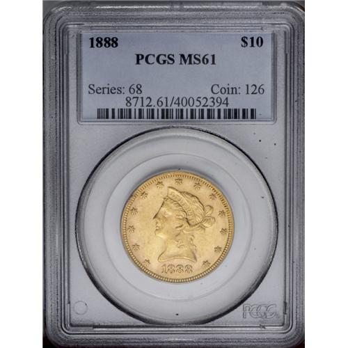 <B>1888<$10> MS61 PCGS.</B></I> Numerous small marks frequent the obverse field and portrait, but the luster is extensive. The centers are typically struck. A better date, as are all P-mint eagles between 1883 and 1891. Population: 24 in 61, 17 finer (3/06). <BR><BR><B>Important notice:</B> Heritage usually auctions material at the rate of 200-250 lots per hour. On some occasions eBay Live bid software or the Internet may not be able to keep up with the pace of the auction. We recommend placing a realistic absentee bid now as insurance to avoid disappointment. Occasionally the auctioneer may eliminate or reject an eBay Live bid, and the auctioneer may also reopen a lot after the close of the eBay live bidding (usually because we missed an audience bid), and may reject your bid even if it shows you as the winning bidder. By bidding via eBay Live, you agree that Heritage may award the lot to another bidder at its sole discretion under the circumstances described above or any other reasonable circumstances. Since eBay bids are not shown to us until we open the lot on the floor, we treat those bids just like floor bids. In most cases the floor responds before the eBay bid is presented to us, due to Internet lag time, so for consistency we have made it a policy that floor bids are always considered first over tie eBay live bids. Also please note that all Heritage lots purchased through eBay Live carry a 20% Buyer's Premium. Please make sure you read the Terms and Conditions before you bid. This lot is being auctioned in conjunction with a live floor auction by Heritage Galleries & Auctioneers. All final auction and invoice information will be supplied by Heritage Galleries & Auctioneers, and all other information should be considered preliminary. Lot:4009 <BR><BR><B>Winning Notification and Billing:</B> After the FINAL session in this auction is complete, Heritage will send e-mail and snail mail invoices. This process normally takes several days. All final auction and invoice information will be supplied by Heritage Galleries & Auctioneers, and all other information should be considered preliminary. <BR><BR>This auction will be conducted on a live auction floor and over the Internet through eBay Live. If you choose to place an absentee bid, please take a moment to <font color='#0000ff'><u><a href='http://pages.ebay.com/liveauctions/help/before/laabsentee.html'>learn how eBay Live absentee bidding works</a></u></font><font color='#000000'>