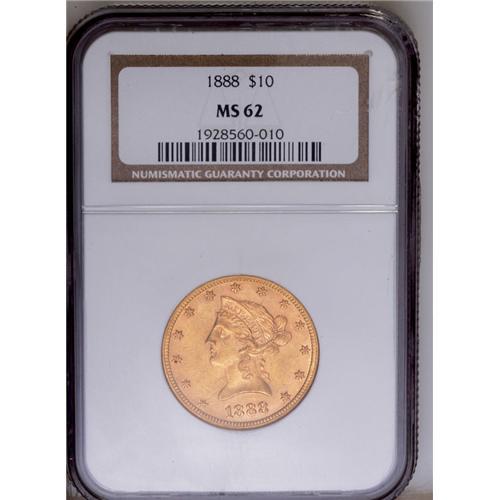 <B>1888<$10> MS62 NGC.</B></I> A rare and underrated issue that is seldom encountered at any level of Mint State. This piece is fully lustrous with a nice strike and the small surface marks one might expect of this grade. Census: 27 in 62, 2 finer (7/06).