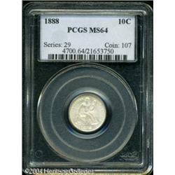 1888 10C MS64 PCGS. Booming luster and pleasing sk <B>1888 10C MS64 PCGS.</B></I> Booming luster and pleasing sky-blue and apricot color combine with undisturbed surfaces for impressive eye appeal. The base of the final 8 in the date is recut. Population: 47 in 64, 54 finer (11/04). <BR><BR><B>Important notice:</B> Heritage usually auctions material at the rate of 200-250 lots per hour. On some occasions eBay Live bid software or the Internet may not be able to keep up with the pace of the auction. We recommend placing a realistic absentee bid now as insurance to avoid disappointment. Occasionally the auctioneer may eliminate or reject an eBay Live bid, and the auctioneer may also reopen a lot after the close of the eBay live bidding (usually because we missed an audience bid), and may reject your bid even if it shows you as the winning bidder. By bidding via eBay Live, you agree that Heritage may award the lot to another bidder at its sole discretion under the circumstances described above or any other reasonable circumstances. Since eBay bids are not shown to us until we open the lot on the floor, we treat those bids just like floor bids. In most cases the floor responds before the eBay bid is presented to us, due to Internet lag time, so for consistency we have made it a policy that floor bids are always considered first over tie eBay live bids. Also please note that all Heritage lots purchased through eBay Live carry a 20% Buyer's Premium. Please make sure you read the Terms and Conditions before you bid. This lot is being auctioned in conjunction with a live floor auction by Heritage Galleries & Auctioneers. All final auction and invoice information will be supplied by Heritage Galleries & Auctioneers, and all other information should be considered preliminary. Lot:5746