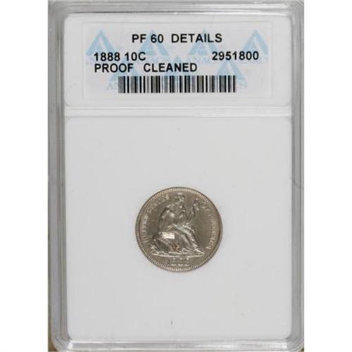 <B>1888 10C --Cleaned--ANACS. PF 60 Details.</B></I> NGC Census: (0/159). PCGS Population (2/152). Mintage: 832. Numismedia Wsl. Price for NGC/PCGS coin in PR60: $220. (#4785)<BR><BR><B>Coin Engraver:</B> Christian Gobrecht<BR><BR><b>Shipping:</b> Coins & Currency (<a target="_blank" href="http://www.heritageauctions.com/common/shipping.php">view shipping information</a>)