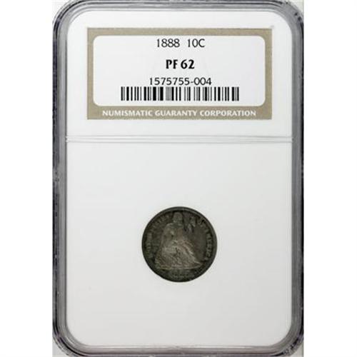 <B>1888 10C PR62 NGC.</B></I> NGC Census: (9/153). PCGS Population (19/123). Mintage: 832. Numismedia Wsl. Price for NGC/PCGS coin in PR62: $275. (#4785)<BR><BR><B>Coin Engraver:</B> Christian Gobrecht<BR><BR><b>Shipping:</b> Coins & Currency (<a target="_blank" href="http://www.heritageauctions.com/common/shipping.php">view shipping information</a>)