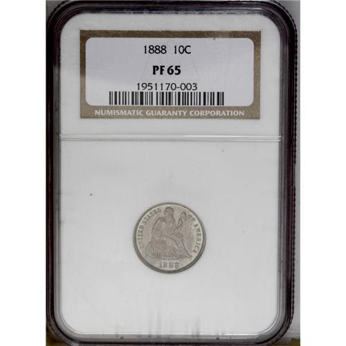 <B>1888<10C> PR65 NGC.</B></I> Milky mauve and golden toning coats each side of this well mirrored specimen. A nicely preserved survivor from a mintage of 832 proofs. Census: 38 in 65, 36 finer (4/06).