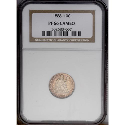 <B>1888<10C> PR66 Cameo NGC.</B></I> Sharply struck with speckled russet-red coloration on both sides. The exquisitely frosted devices are starkly contrasted against deep mirror fields. One of only 832 specimens produced, and extremely scarce as a Premium Gem with the Cameo designation. Census: 4 in 66 Cameo, 6 finer in Cameo condition (1/06).