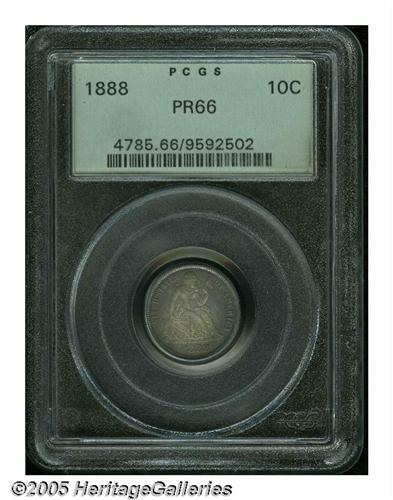 <B>1888<10C> PR66 PCGS.</B></I> Splendidly toned in aquamarine, lime, and peach colors. Crisply struck and essentially pristine. Only 832 proofs were struck. Encapsulated in a green label holder. Population: 14 in 66, 3 finer (4/05).