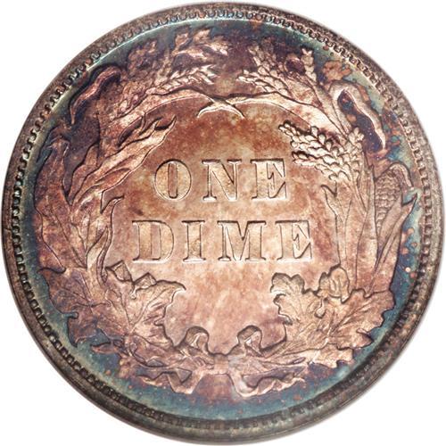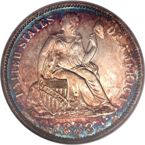 <B>1888 10C PR67 Cameo NGC.</B></I> The eye appeal of this Superb Gem is instantly apparent, and is perhaps its most noteworthy attribute. Luscious electric-blue and purple-red patina adorns the peripheries and the fields, with shimmering mint frost noted on the central devices. A beautiful and conditionally unsurpassed specimen that is well struck throughout. Census: 7 in 67 Cameo, 0 finer (4/07).<BR><BR><b>Shipping:</b> Coins & Currency (<a target="_blank" href="http://www.heritageauctions.com/common/shipping.php">view shipping information</a>)