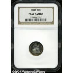 <table><tbody><tr><td><table> <TR><TD width="100%"><TABLE cellSpacing=1 cellPadding=3 width="100%" border=0><TBODY><TR><TD width="100%" bgColor=#79735c><FONT face=arial color=#ffffff size=3><B>Description</B> </FONT></TD></TR><TR><TD width="100%" bgColor=#ffffff><FONT face=arial size=2><B>1888 10C PR67 Cameo NGC.</B></I> The watery surfaces display a remarkable degree of contrast beneath antique-golden, steel-violet, and bluish-green toning, particularly at the obverse border. As would be expected of the grade, there are no mentionable flaws, spots, or other distractions on either side. A carefully preserved specimen that is currently (11/03) tied with two other pieces at both services combined. </FONT></TD></TR></TBODY></TABLE></TD></TR></TBODY></TABLE><BR><A name=PricesRealized></A><TABLE cellSpacing=0 cellPadding=0 width="100%" bgColor=#000000 border=0><TBODY><TR><TD width="100%"><TABLE cellSpacing=1 cellPadding=3 width="100%" border=0><TBODY><TR><TD width="100%" bgColor=#79735c><A name=PR><FONT face=arial color=#ffffff size=3><B>Previous Prices from Heritage Auctions</B> </FONT></A></TD></TR><TR><TD bgColor=#f6f6ed>No Prior Data Recorded </TD></TR><TR><TD bgColor=#ffffff><FONT face=arial size=1 ?>PLEASE NOTE: All prices realized reflect the final hammer price PLUS the buyer's premium in auctions that charge a buyer's premium. Each item has a notation at the top of the listing indicating whether that lot included a buyer's premium. Example: A item that sells with a final hammer price of $100 and a 20% buyer's premium will display with a price realized of $120. All information listed is intended to be as accurate as possible, but errors are possible. Please use this guide carefully and inform us of any inaccuracies. </FONT></TD></TR></TBODY></TABLE></TD></TR></TBODY></TABLE><BR><TABLE cellSpacing=0 cellPadding=0 width="100%" bgColor=#000000 border=0><TBODY><TR><TD width="100%"><TABLE cellSpacing=1 cellPadding=3 width="100%" border=0><TBODY><TR><TD width="100%" bgColor=#79735c colSpan=6><FONT face=arial color=#ffffff size=3><B>Price Guide*</B> </FONT></TD></TR><TR bgColor=#f6f6ed><TD align=middle><B>Grade</B> </TD><TD align=middle><B>Coin World<BR>(Trends)</B> </TD><TD align=middle><B>Numismedia<BR>Retail</B> </TD><TD align=middle><B>Numismedia<BR>Wholesale</B> </TD><TD align=middle><B>Coin<BR>Universe</B> </TD><TD align=middle><B>Heritage<BR>Value Index</B> </TD></TR><TR bgColor=#ffffff><TD align=middle>66</TD><TD align=right>---</TD><TD align=right>---</TD><TD align=right>---</TD><TD align=right>---</TD><TD align=right>---</TD></TR><TR style="FONT-WEIGHT: bold" bgColor=#cccfdd><TD align=middle>67</TD><TD align=right>---</TD><TD align=right>---</TD><TD align=right>---</TD><TD align=right>---</TD><TD align=right>---</TD></TR><TR bgColor=#ffffff><TD align=middle>68</TD><TD align=right>---</TD><TD align=right>---</TD><TD align=right>---</TD><TD align=right>---</TD><TD align=right>---</TD></TR><TR bgColor=#ffffff><TD colSpan=6><FONT size=1>*All information listed is intended to be as accurate as possible, but errors are possible. No item may be returned or refused based on this information which is provided as a service to our customers. You should contact each pricing source directly to determine the accuracy of this information. </FONT></TD></TR></TBODY></TABLE></TD></TR></TBODY></TABLE><BR><TABLE cellSpacing=0 cellPadding=0 width="100%" bgColor=#000000 border=0><TBODY><TR><TD width="100%"><TABLE cellSpacing=1 cellPadding=3 width="100%" border=0><TBODY><TR><TD width="100%" bgColor=#79735c><FONT face=arial color=#ffffff size=3><B>Population Guide</B> </FONT></TD></TR><TR bgColor=#ffffff><TD align=middle><!-- Begin Output of Population Grid--><TABLE cellSpacing=0 cellPadding=0 width="100%" border=0><TBODY><TR><TD vAlign=center><TABLE cellSpacing=0 width="100%" border=1 cellsadding="3"><TBODY><TR><TD vAlign=center><TABLE cellSpacing=0 cellPadding=3 width="100%" border=1><TBODY><TR><TD vAlign=center align=middle bgColor=#f0f1e8 colSpan=2 <CENTER><FONT face=Arial size=2><B>PCGS Pop </B></FONT><CENTER></CENTER></TD><TD vAlign=center align=middle bgColor=#f0f1e8 colSpan=2><CENTER><FONT face=Arial size=2><B>NGC Pop</B></CENTER></FONT></TD></TR><TR><TD vAlign=center><FONT face=Arial size=2>(67)</FONT> </TD><TD vAlign=center align=right><FONT face=Arial size=2>1</FONT> </TD><TD vAlign=center><FONT face=Arial size=2>(67)</FONT> </TD><TD vAlign=center align=right><FONT face=Arial size=2>2</FONT> </TD></TR><TR><TD vAlign=center><FONT face=Arial size=2>(>67)</FONT> </TD><TD vAlign=center align=right><FONT face=Arial size=2>0</FONT> </TD><TD vAlign=center><FONT face=Arial size=2>(>67)</FONT> </TD><TD vAlign=center align=right><FONT face=Arial size=2>0</FONT> </TD></TR></TBODY></TABLE></TD></TR></TBODY></TABLE></TD></TR></TBODY></TABLE><!-- End Output of Population Grid--></TD></TR></TBODY></TABLE></TD></TR></TBODY></TABLE><BR><TABLE cellSpacing=0 cellPadding=0 width="100%" bgColor=#000000 border=0><TBODY><TR> <font color='#000000'><span style='background-color: #FFFFFF'><td bgcolor='#FFFFFE'> Important notice: Heritage usually auctions material at the rate of 200-250 lots per hour. On some occasions eBay Live bid software or the Internet may not be able to keep up with the pace of the auction. We recommend placing a realistic absentee bid now as insurance to avoid disappointment. Occasionally the auctioneer may eliminate or reject an eBay Live bid, and the auctioneer may also reopen a lot after the close of the eBay live bidding (usually because we missed an audience bid), and may reject your bid even if it shows you as the winning bidder. By bidding via eBay Live, you agree that Heritage may award the lot to another bidder at its sole discretion under the circumstances described above or any other reasonable circumstances. Since eBay bids are not shown to us until we open the lot on the floor, we treat those bids just like floor bids. In most cases the floor responds before the eBay bid is presented t