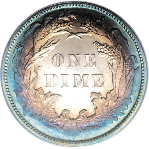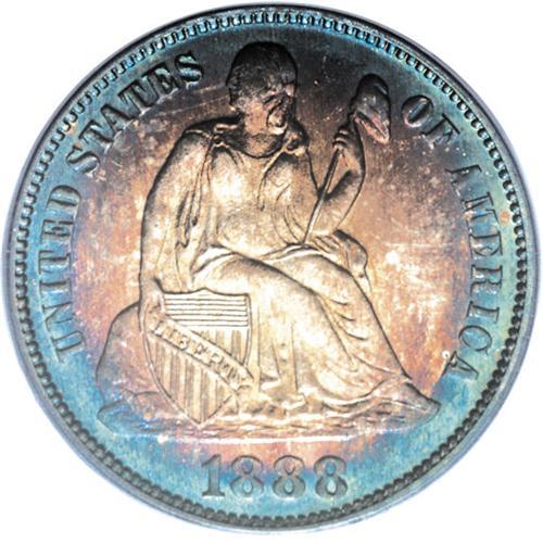 <B>1888 10C PR67 PCGS.</B></I> The 2007 <I>Guide Book</B></I> shows 832 proof dimes struck in 1888. PCGS and NGC have certified nearly 400 examples, primarily through the PR66 level. Gorgeous cobalt-blue, lavender, and golden-brown toning at the margins frames near-brilliant centers on this Superb Gem, and a well executed strike brings out most of the design features. Both sides are immaculately preserved. Population: 4 in 67, 0 finer (4/07).<BR><I>From The Utah Collection.</B></I><BR><BR><b>Shipping:</b> Coins & Currency (<a target="_blank" href="http://www.heritageauctions.com/common/shipping.php">view shipping information</a>)