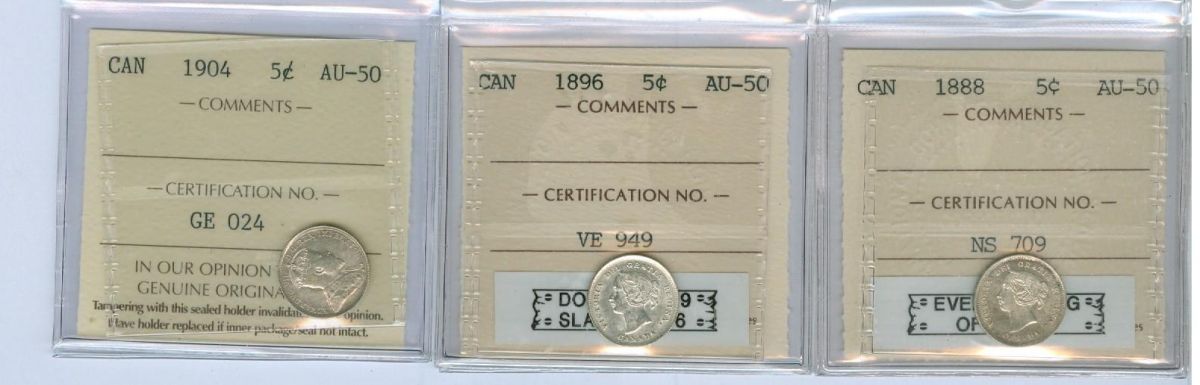 1888, 1896 & 1904 5¢ ICCS AU50. Lot of 3 coins.