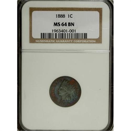 <B>1888 1C MS64 Brown NGC.</B></I> NGC Census: (86/26). PCGS Population (24/5). Mintage: 37,494,416. Numismedia Wsl. Price for NGC/PCGS coin in MS64: $200. (#2166)<BR><BR><B>Coin Engraver:</B> James B. Longacre<BR><BR><b>Shipping:</b> Coins & Currency (<a target="_blank" href="http://www.heritageauctions.com/common/shipping.php">view shipping information</a>)