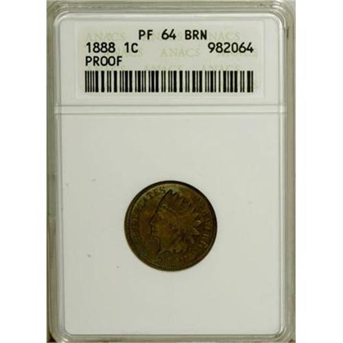 <B>1888 1C PR64 Brown ANACS.</B></I> NGC Census: (42/48). PCGS Population (54/34). Mintage: 4,582. Numismedia Wsl. Price for NGC/PCGS coin in PR64: $152. (#2351)<BR><BR><B>Coin Engraver:</B> James B. Longacre<BR><BR><b>Shipping:</b> Coins & Currency (<a target="_blank" href="http://www.heritageauctions.com/common/shipping.php">view shipping information</a>)