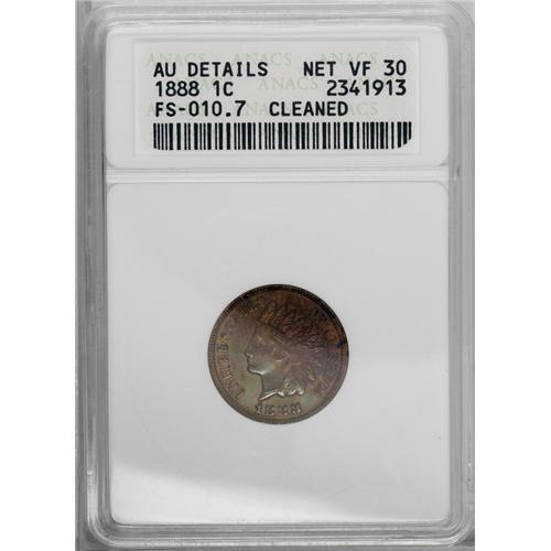 <B>1888<1C>--Cleaned--ANACS. AU Details, Net VF30.</B></I> FS-010.7, Snow-2. Considered by some numismatists to be an 1888/7 variety. Also, the flag of a misplaced 1 emerges from the left border of Liberty's necklace. Tooling on the portrait and left obverse field is made less evident by a bright cleaning and rich tobacco-brown, lime-green, and rose toning. <BR><BR><B>Important notice:</B> Heritage usually auctions material at the rate of 200-250 lots per hour. On some occasions eBay Live bid software or the Internet may not be able to keep up with the pace of the auction. We recommend placing a realistic absentee bid now as insurance to avoid disappointment. Occasionally the auctioneer may eliminate or reject an eBay Live bid, and the auctioneer may also reopen a lot after the close of the eBay live bidding (usually because we missed an audience bid), and may reject your bid even if it shows you as the winning bidder. By bidding via eBay Live, you agree that Heritage may award the lot to another bidder at its sole discretion under the circumstances described above or any other reasonable circumstances. Since eBay bids are not shown to us until we open the lot on the floor, we treat those bids just like floor bids. In most cases the floor responds before the eBay bid is presented to us, due to Internet lag time, so for consistency we have made it a policy that floor bids are always considered first over tie eBay live bids. Also please note that all Heritage lots purchased through eBay Live carry a 20% Buyer's Premium. Please make sure you read the Terms and Conditions before you bid. This lot is being auctioned in conjunction with a live floor auction by Heritage Galleries & Auctioneers. All final auction and invoice information will be supplied by Heritage Galleries & Auctioneers, and all other information should be considered preliminary. Lot:406 <BR><BR><B>Winning Notification and Billing:</B> After the FINAL session in this auction is complete, Heritage will send e-mail and snail mail invoices. This process normally takes several days. All final auction and invoice information will be supplied by Heritage Galleries & Auctioneers, and all other information should be considered preliminary. <BR><BR>This auction will be conducted on a live auction floor and over the Internet through eBay Live. If you choose to place an absentee bid, please take a moment to <font color='#0000ff'><u><a href='http://pages.ebay.com/liveauctions/help/before/laabsentee.html'>learn how eBay Live absentee bidding works</a></u></font><font color='#000000'>