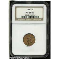 1888 1C MS64 Red NGC. A couple of tiny marks are n <B>1888 1C MS64 Red NGC.</B></I> A couple of tiny marks are noted on the Indian's chin. The lustrous surfaces display orange patina with cherry-red overtones, and motifs that are well struck. <BR><BR><B>Important notice:</B> Heritage usually auctions material at the rate of 200-250 lots per hour. On some occasions eBay Live bid software or the Internet may not be able to keep up with the pace of the auction. We recommend placing a realistic absentee bid now as insurance to avoid disappointment. Occasionally the auctioneer may eliminate or reject an eBay Live bid, and the auctioneer may also reopen a lot after the close of the eBay live bidding (usually because we missed an audience bid), and may reject your bid even if it shows you as the winning bidder. By bidding via eBay Live, you agree that Heritage may award the lot to another bidder at its sole discretion under the circumstances described above or any other reasonable circumstances. Since eBay bids are not shown to us until we open the lot on the floor, we treat those bids just like floor bids. In most cases the floor responds before the eBay bid is presented to us, due to Internet lag time, so for consistency we have made it a policy that floor bids are always considered first over tie eBay live bids. Also please note that all Heritage lots purchased through eBay Live carry a 20% Buyer's Premium. Please make sure you read the Terms and Conditions before you bid. This lot is being auctioned in conjunction with a live floor auction by Heritage Galleries & Auctioneers. All final auction and invoice information will be supplied by Heritage Galleries & Auctioneers, and all other information should be considered preliminary. Lot:5099