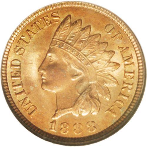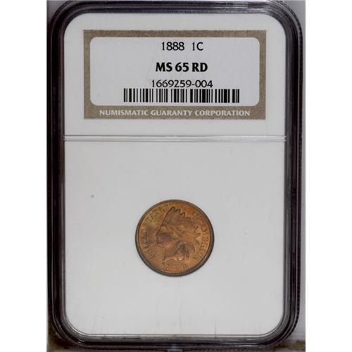 <B>1888<1C> MS65 Red NGC.</B></I> The 1888 is curiously elusive in the better grades of Mint State, especially with full red color. This piece shows deep, even cherry-red color that sparkles when held beneath a light. Sharply struck on the obverse, but the shield on the reverse shows noticeable weakness. An unspotted Gem. Census: 18 in 65, 2 finer (3/06). <BR><BR><B>Important notice:</B> Heritage usually auctions material at the rate of 200-250 lots per hour. On some occasions eBay Live bid software or the Internet may not be able to keep up with the pace of the auction. We recommend placing a realistic absentee bid now as insurance to avoid disappointment. Occasionally the auctioneer may eliminate or reject an eBay Live bid, and the auctioneer may also reopen a lot after the close of the eBay live bidding (usually because we missed an audience bid), and may reject your bid even if it shows you as the winning bidder. By bidding via eBay Live, you agree that Heritage may award the lot to another bidder at its sole discretion under the circumstances described above or any other reasonable circumstances. Since eBay bids are not shown to us until we open the lot on the floor, we treat those bids just like floor bids. In most cases the floor responds before the eBay bid is presented to us, due to Internet lag time, so for consistency we have made it a policy that floor bids are always considered first over tie eBay live bids. Also please note that all Heritage lots purchased through eBay Live carry a 20% Buyer's Premium. Please make sure you read the Terms and Conditions before you bid. This lot is being auctioned in conjunction with a live floor auction by Heritage Galleries & Auctioneers. All final auction and invoice information will be supplied by Heritage Galleries & Auctioneers, and all other information should be considered preliminary. Lot:409 <BR><BR><B>Winning Notification and Billing:</B> After the FINAL session in this auction is complete, Heritage will send e-mail and snail mail invoices. This process normally takes several days. All final auction and invoice information will be supplied by Heritage Galleries & Auctioneers, and all other information should be considered preliminary. <BR><BR>This auction will be conducted on a live auction floor and over the Internet through eBay Live. If you choose to place an absentee bid, please take a moment to <font color='#0000ff'><u><a href='http://pages.ebay.com/liveauctions/help/before/laabsentee.html'>learn how eBay Live absentee bidding works</a></u></font><font color='#000000'>