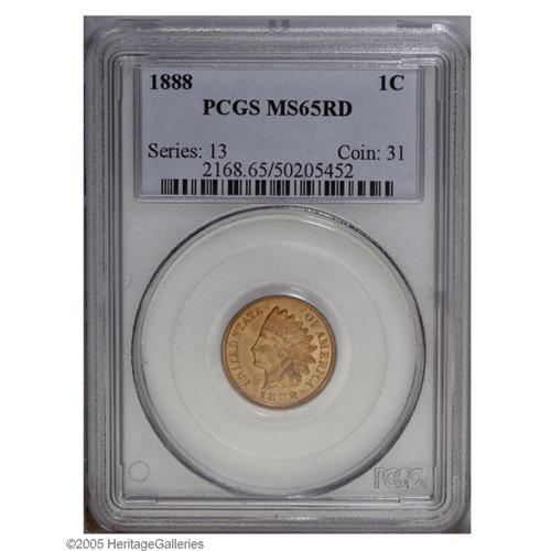 <B>1888<1C> MS65 Red PCGS.</B></I> Lustrous and nearly unabraded. Well struck save for unimportant incompleteness on the shield and bust truncation. The brick-red color is seamless throughout, aside from a tiny areas of aqua color on the eyebrow and on the lower right border of the E in ONE. Population: 27 in 65 Red, 13 finer (9/05).